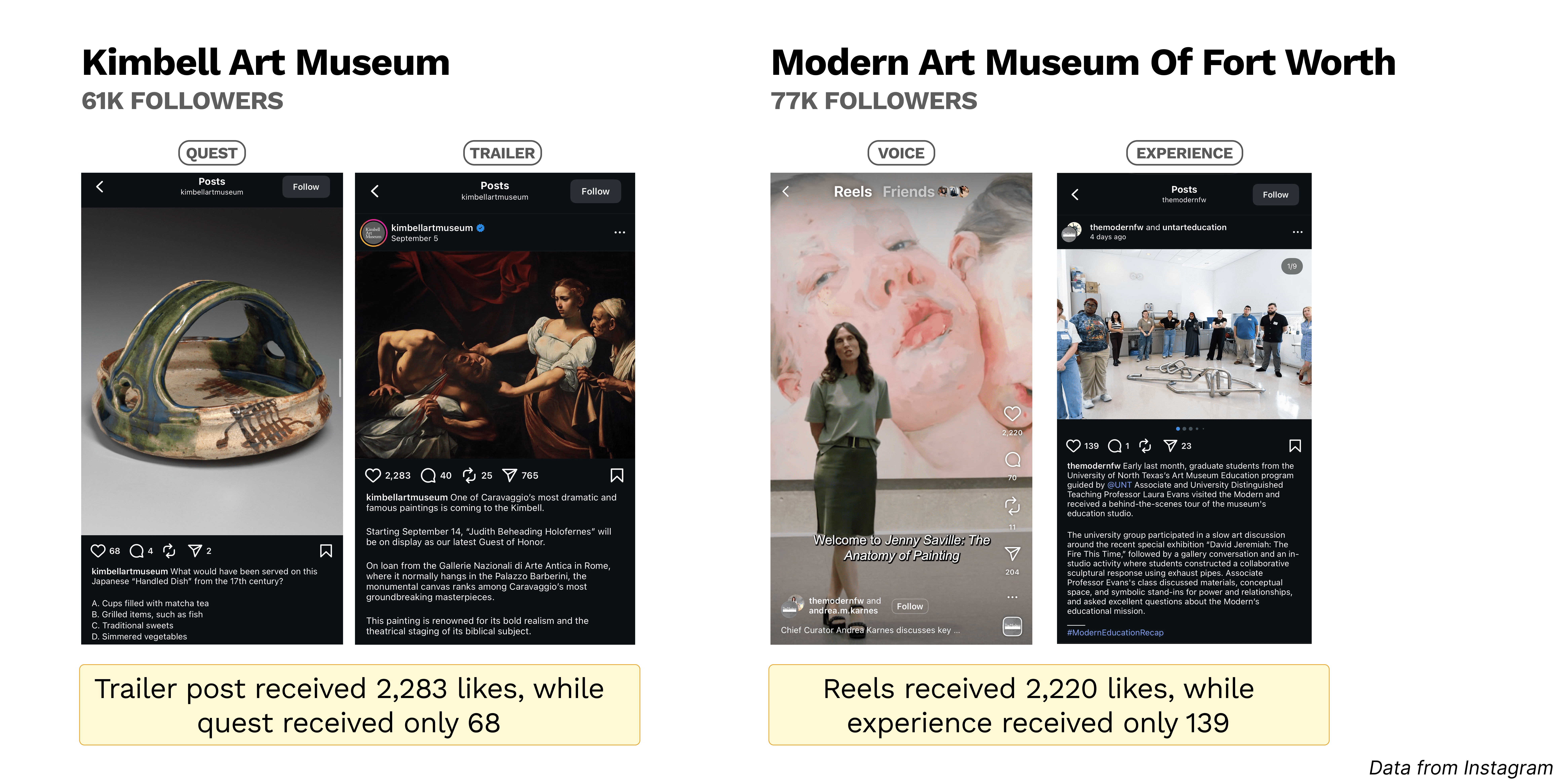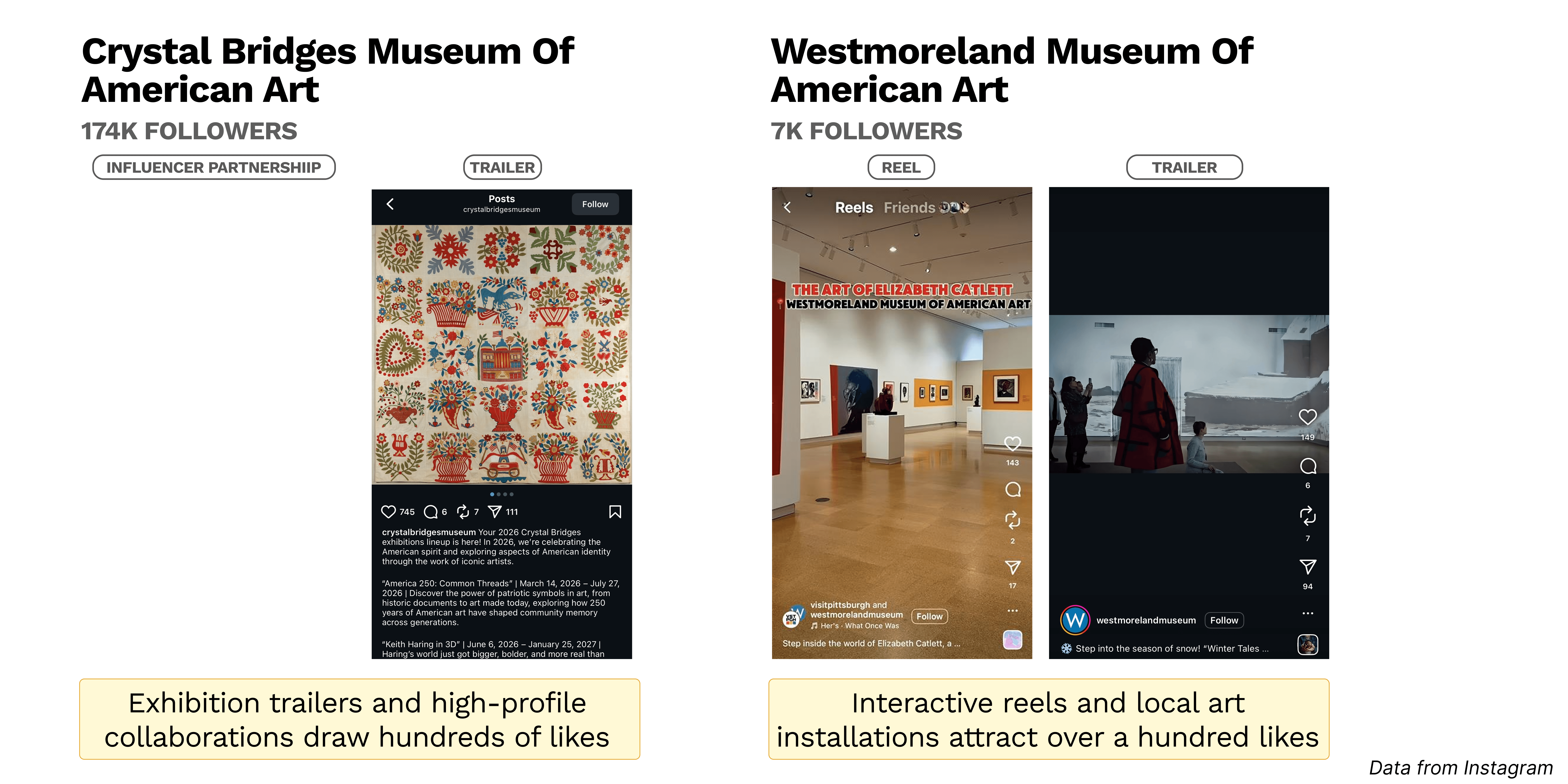 Across all benchmarked institutions, such as Kimbell Art Museum, the Modern Art Museum of Fort Worth, Crystal Bridges, and Westmoreland , they all share one pattern: the museums that perform best on Instagram consistently lean into three content strengths: human voice, cinematic exhibition trailers, and immersive experience-based storytelling.