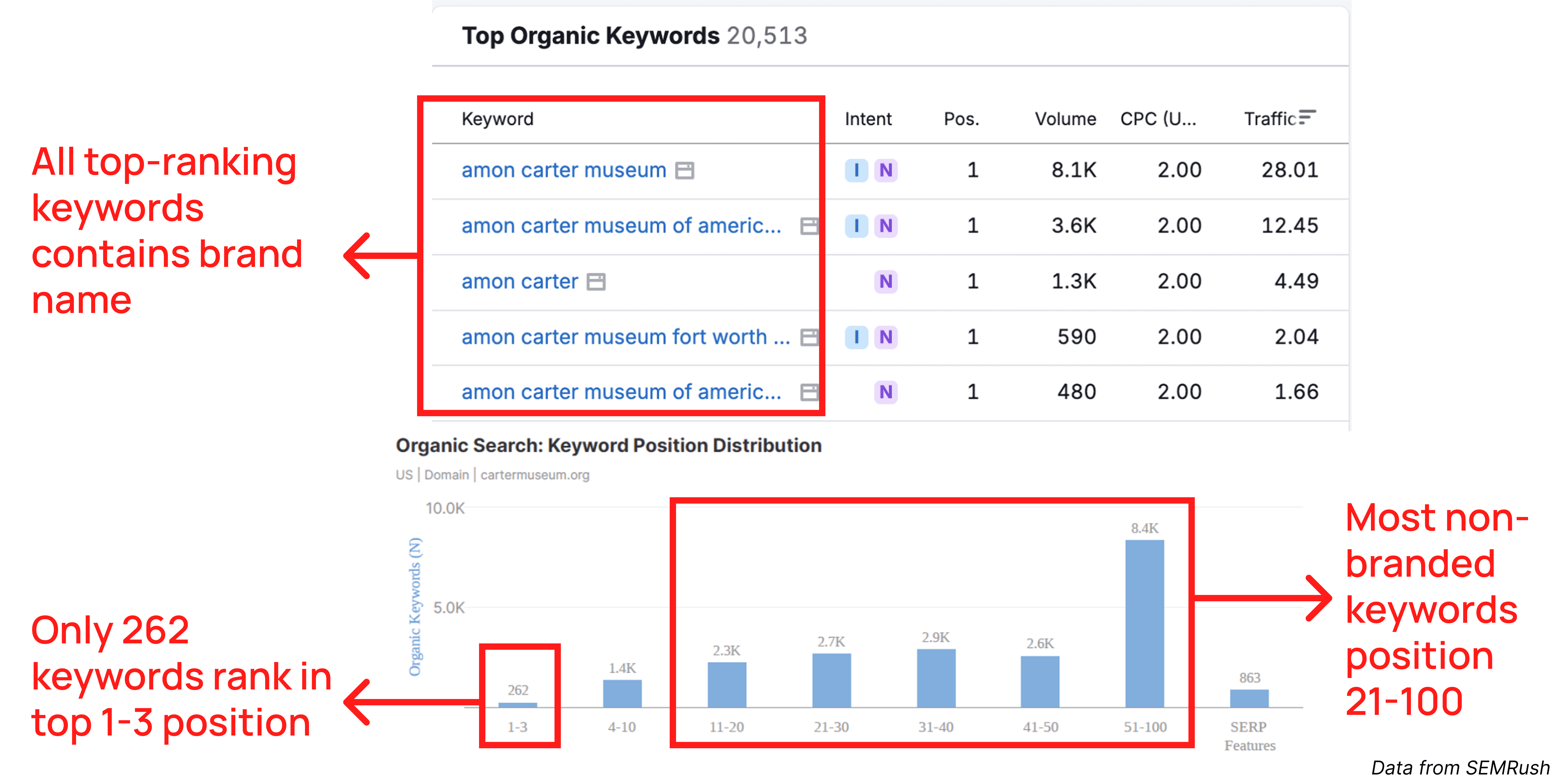 Most non-branded keywords rank between positions 21–100, and only 863 keywords trigger SERP features. This means that users searching for topics like Western art, American artists, Fort Worth things to do, museum exhibits, or art history information are far less likely to discover the Carter organically.