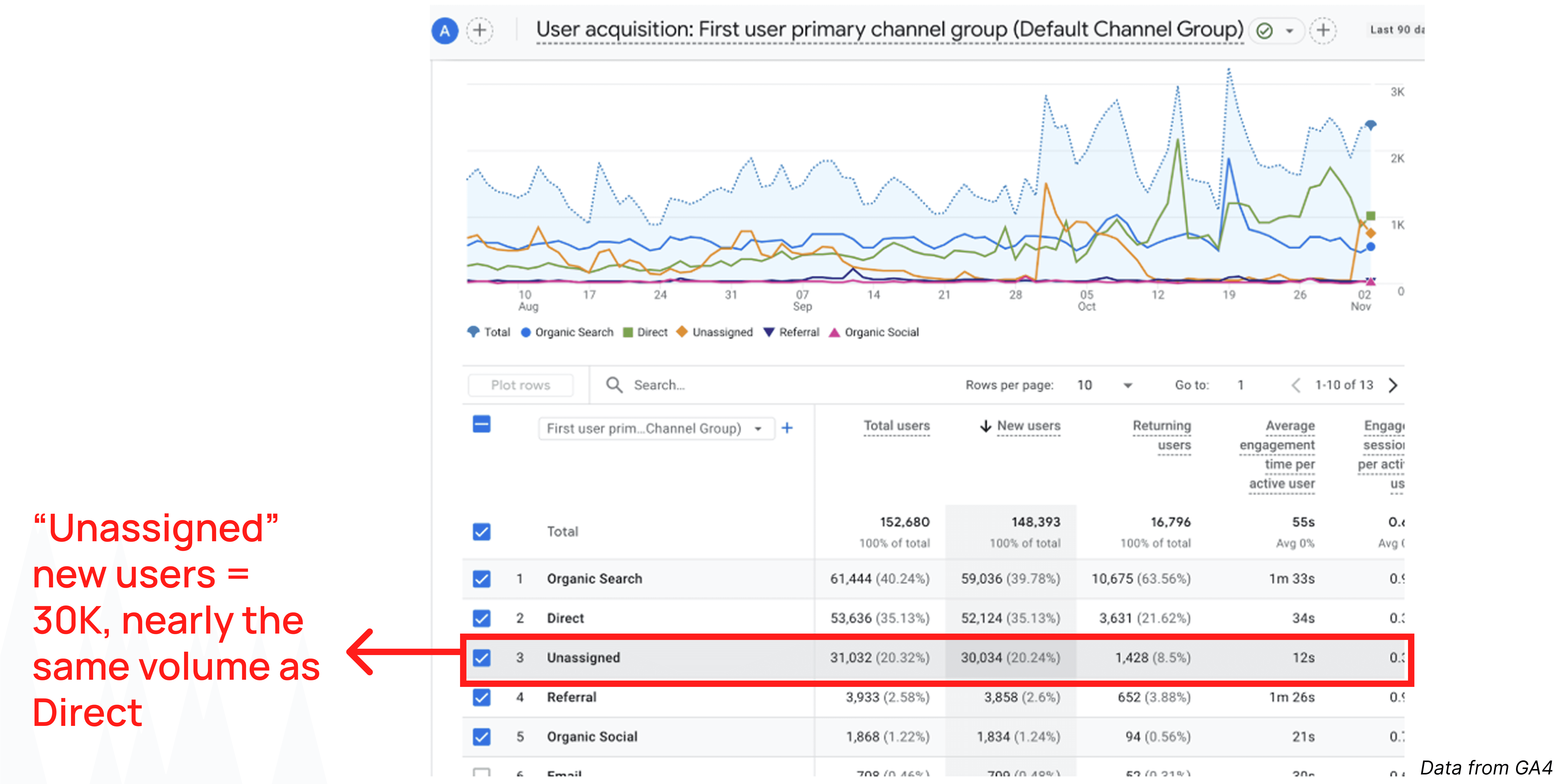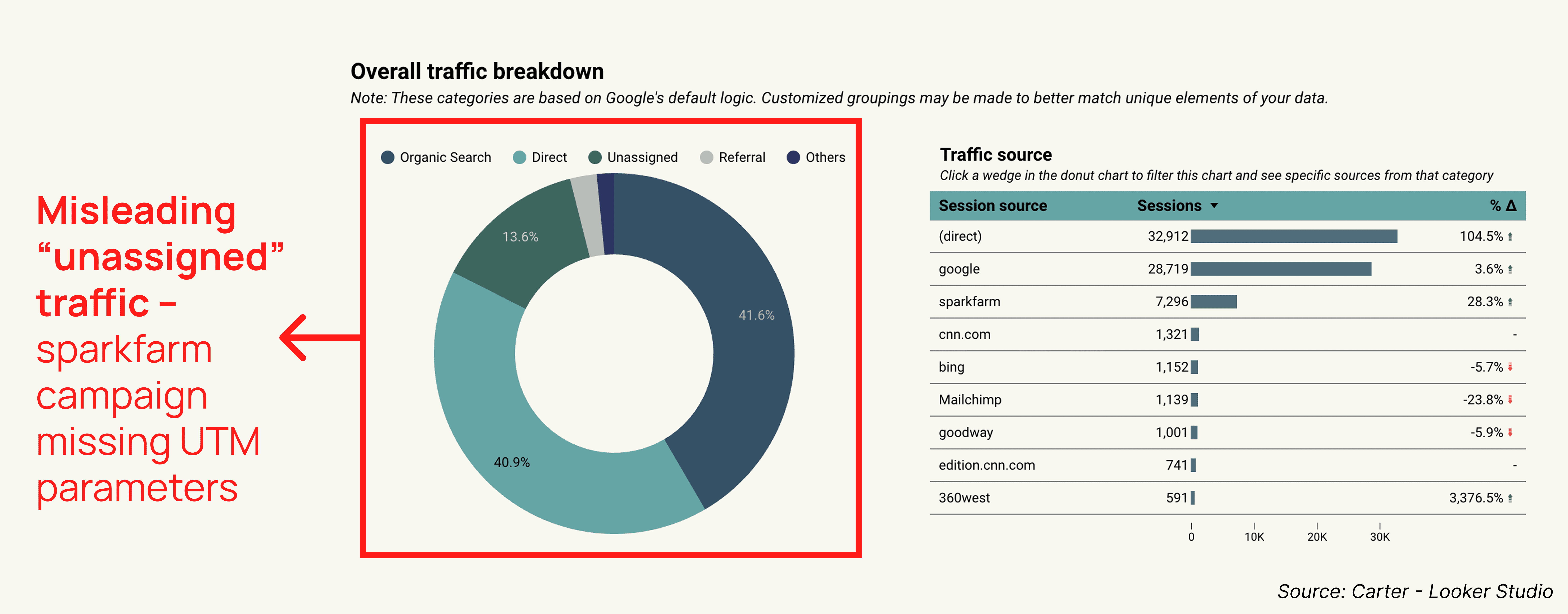 “Unassigned” showed up as the third-largest traffic source. Upon inspection, it came from the sparkfarm campaign, which lacked UTM parameters, making GA4 unable to categorize it. This distorted the Carter’s understanding of channel performance, campaign ROI, and marketing investment decision-making.