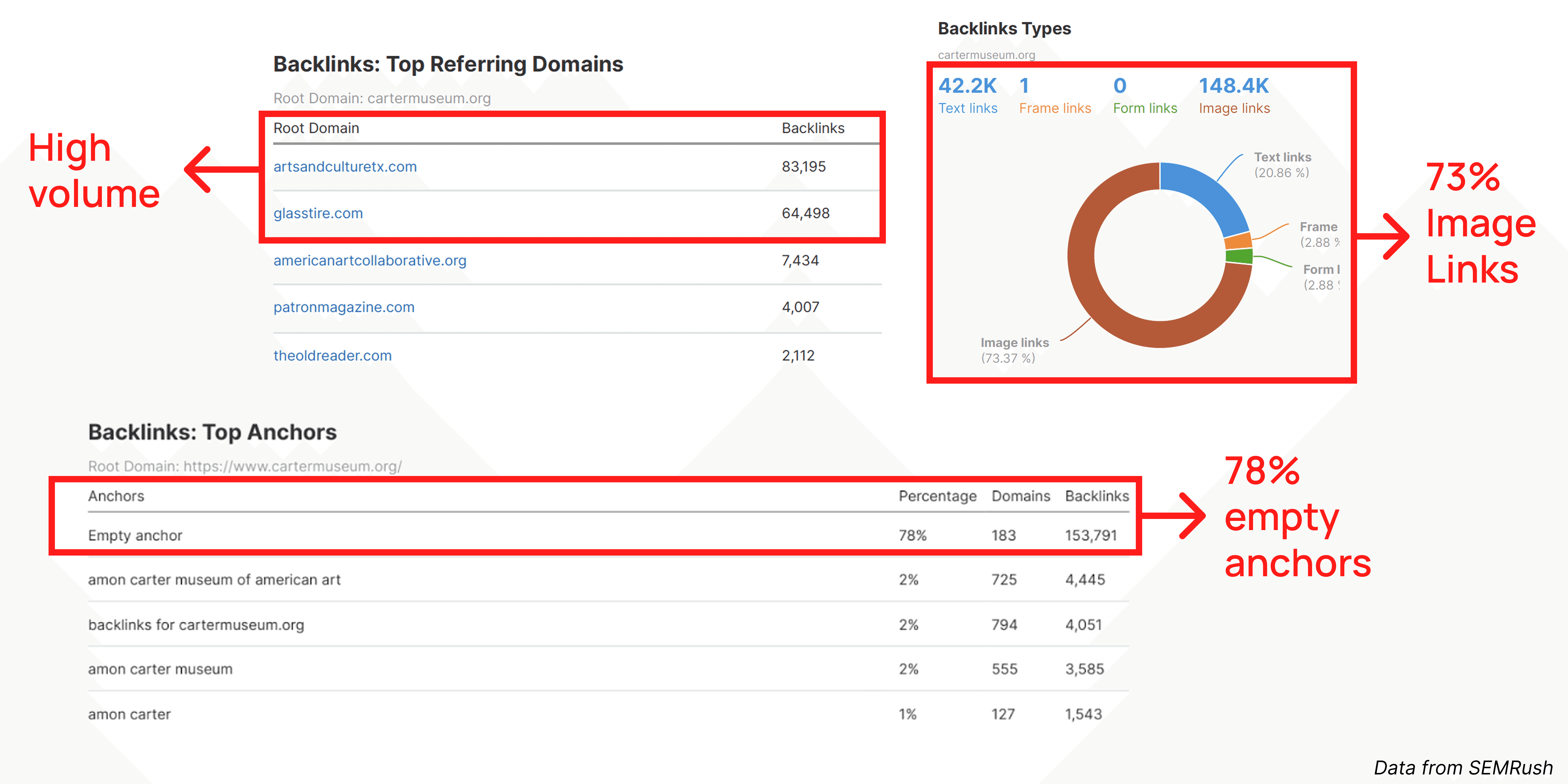 Additionally, 73% of all backlinks are image-type links. While visually fine for users, image links provide little to no semantic meaning for Google. Without descriptive anchor text, search engines can’t associate these backlinks with relevant topics such as exhibitions, artists, or educational content.