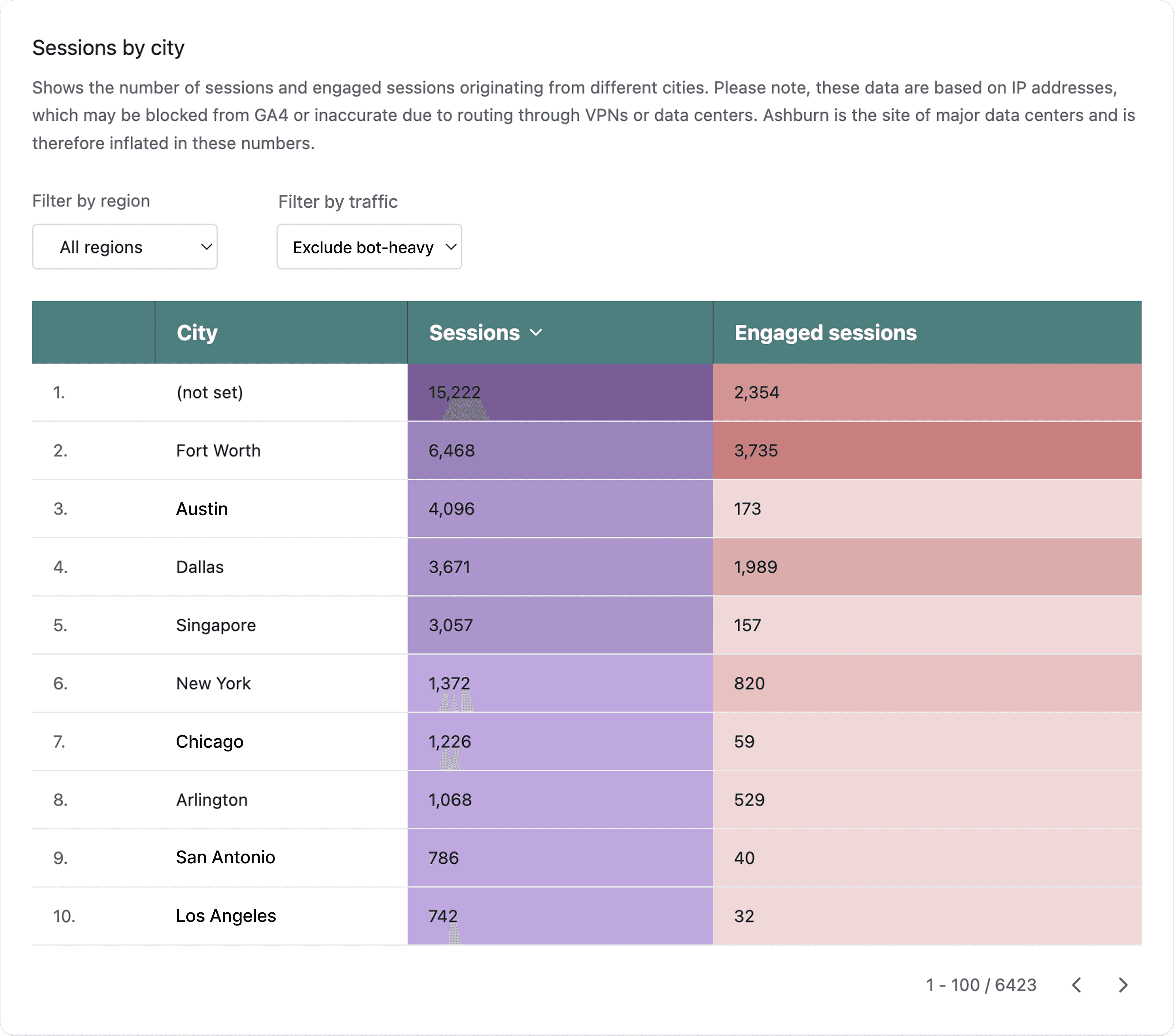 Mockup of Sessions by City Component with Exclude Bot-Heavy filtered