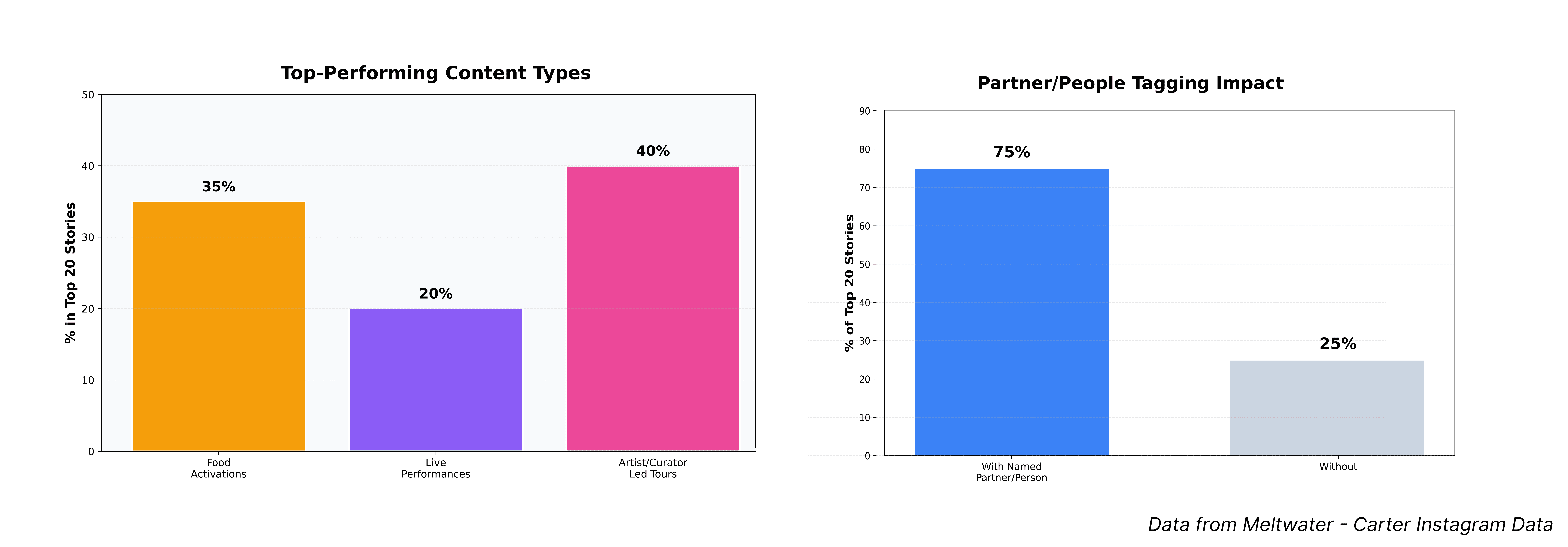 Competitors’ highest-engagement posts showcase curators and artists speaking directly to the audience, dynamic trailer-style Reels that build anticipation, and in-the-moment experiences featuring people, movement, and partnerships.