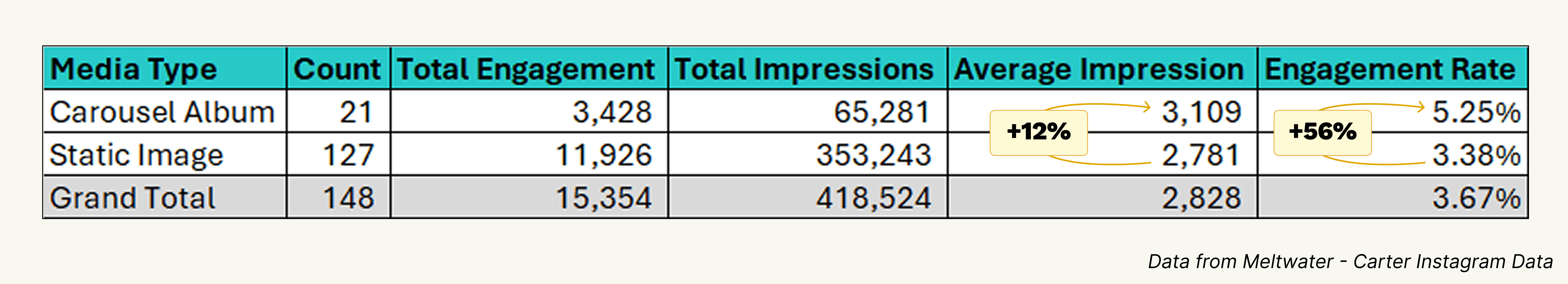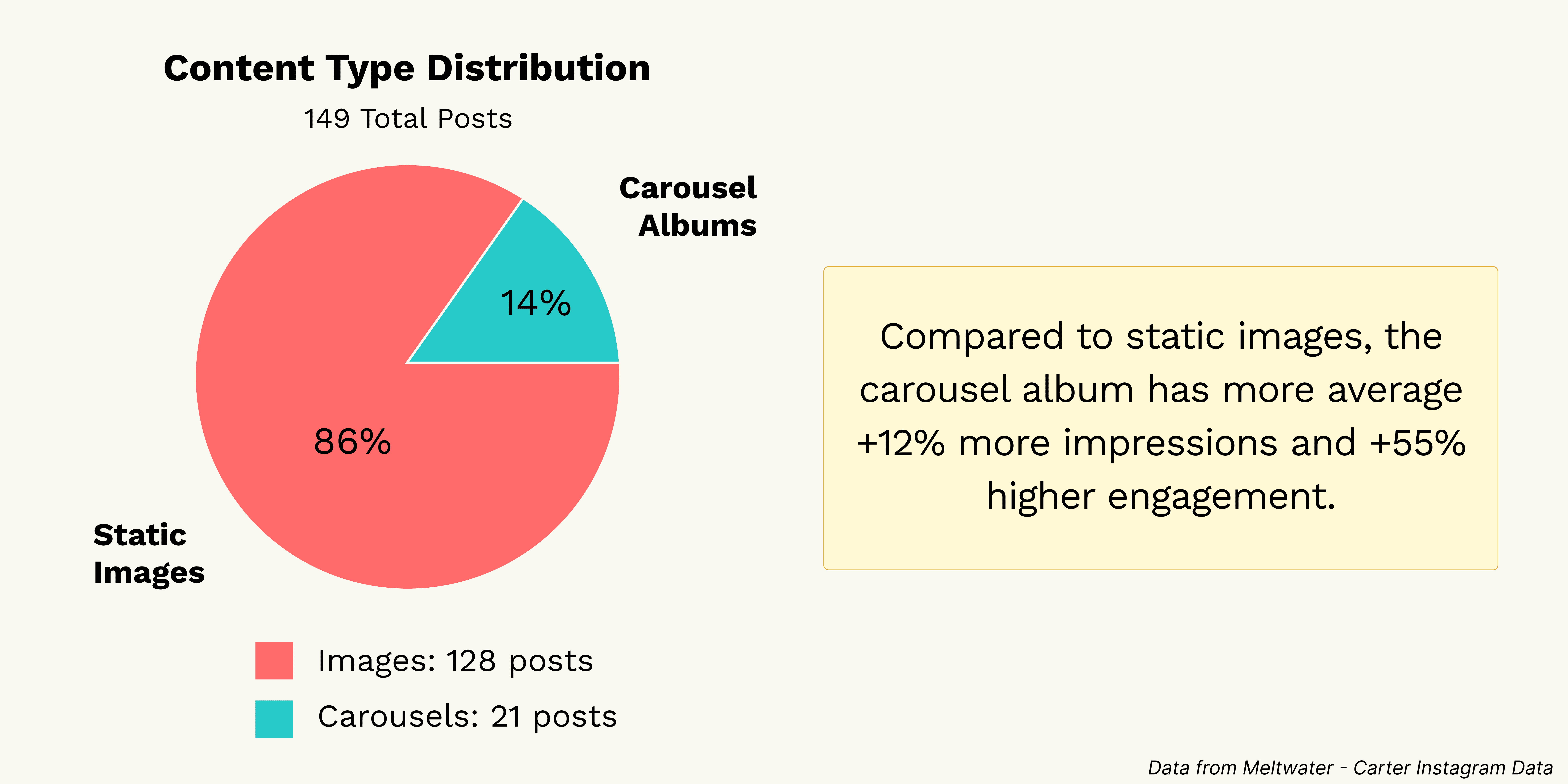 Carousel posts deliver +56% higher engagement than single-image posts, but represent only 14% of total output. Static images dominate the feed (86%), despite underperforming on both impressions and engagement.