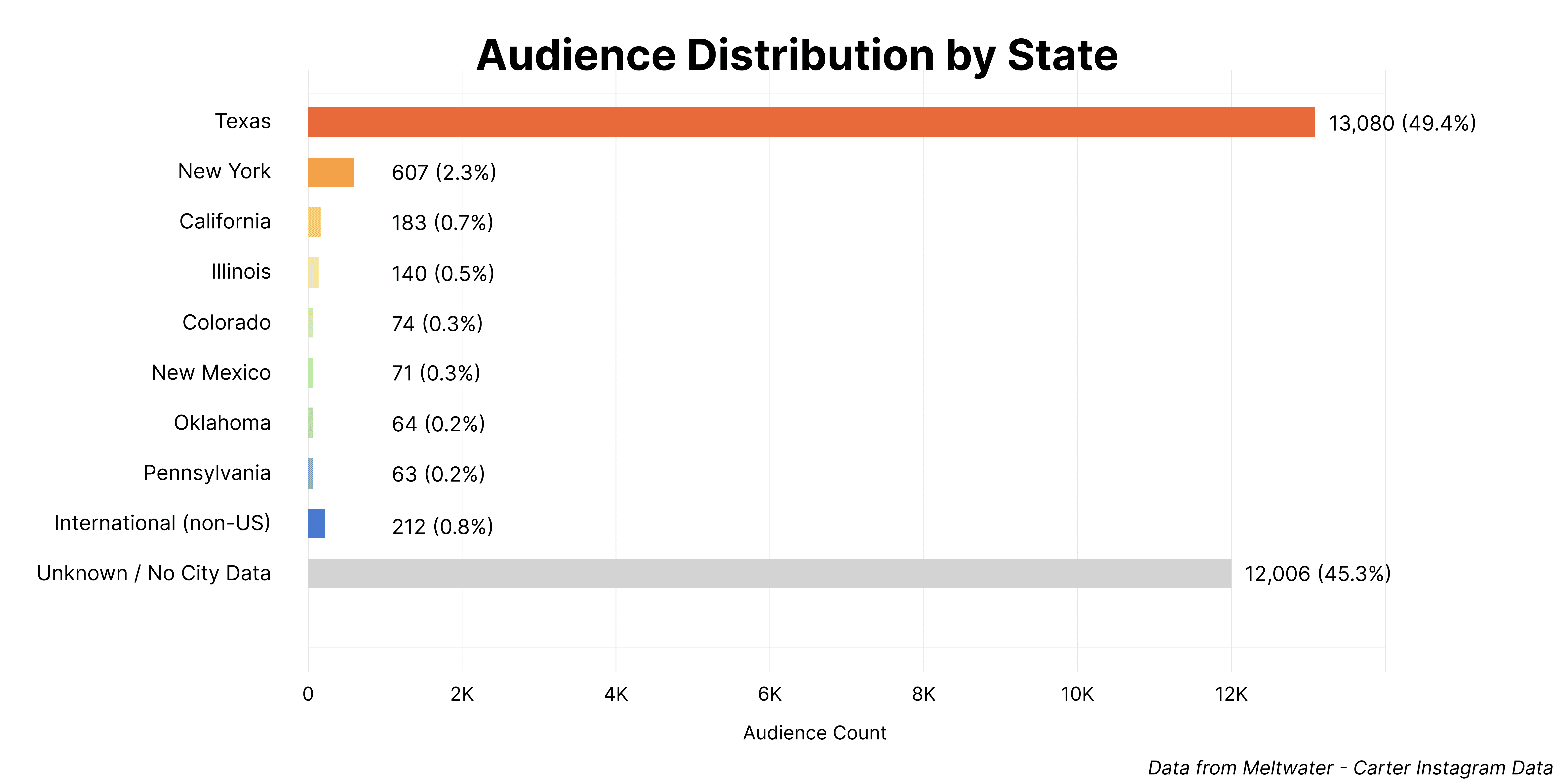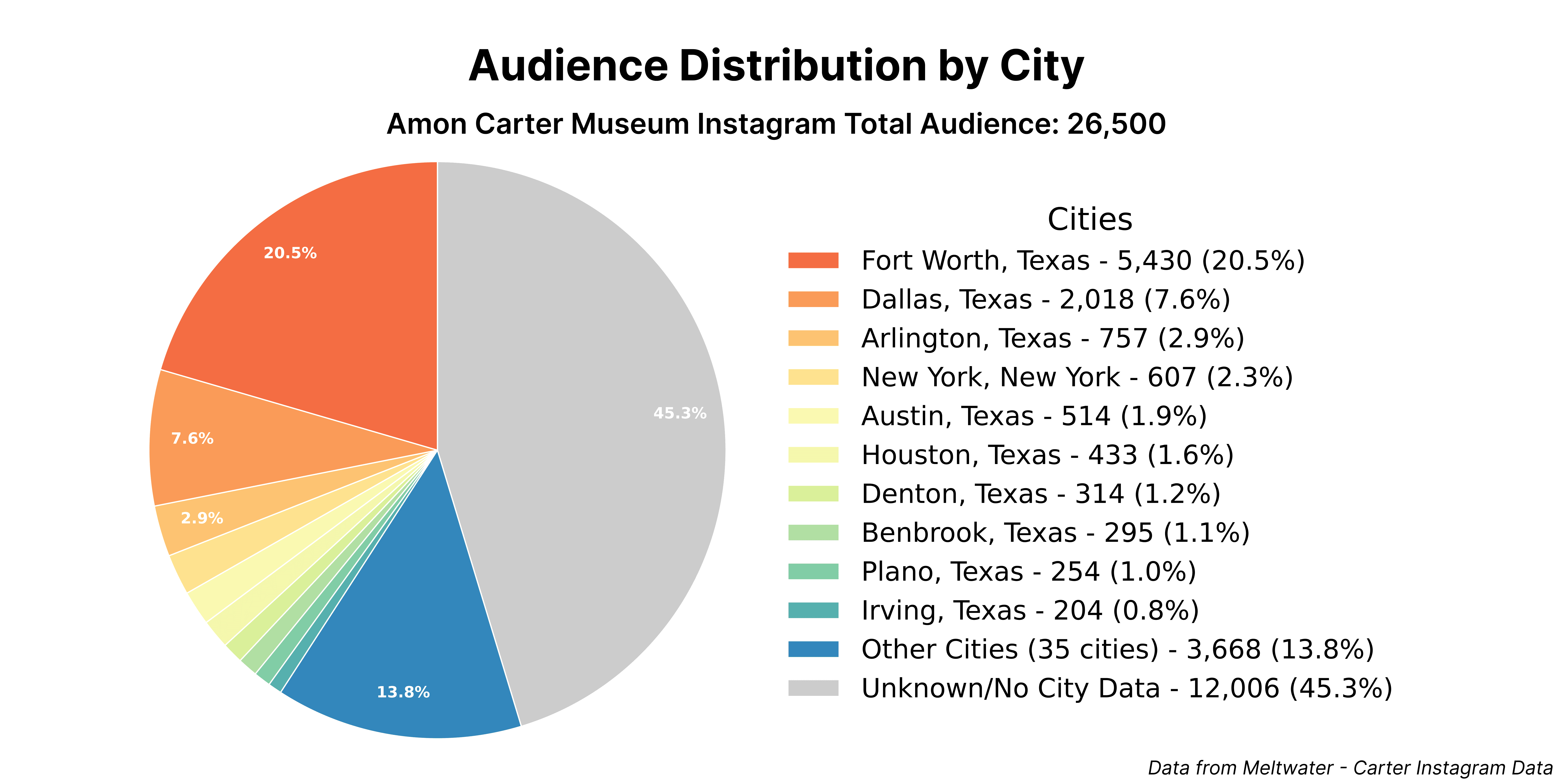 Fort Worth represents 20.5% of the total audience (5,430 followers), with the broader DFW metro area comprising 31% (8,205 followers). This strong, local foundation is ideal for museum visitation conversion.
