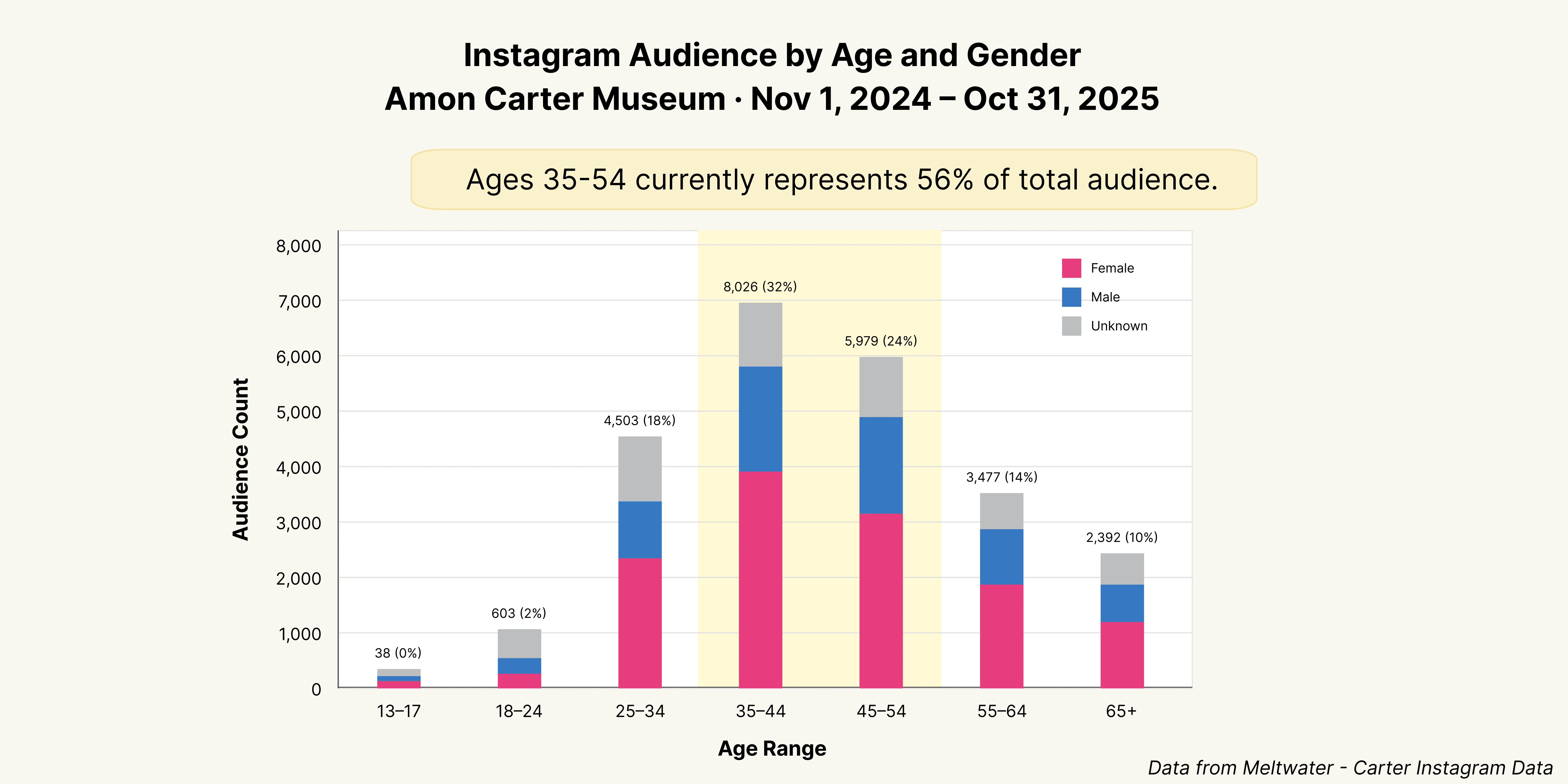 This skew indicates that current content formats and storytelling approaches resonate more with existing midlife followers than with next-generation museum visitors.