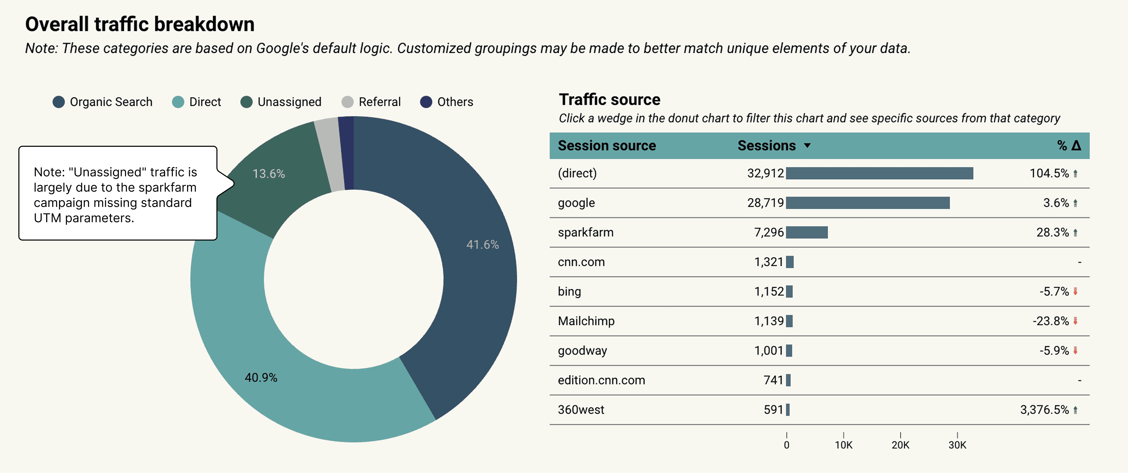 To address this, we recommend adding a text box annotation next to the "Traffic Sources" chart explaining that "Unassigned" traffic is largely due to the sparkfarm campaign missing standard UTM parameters.