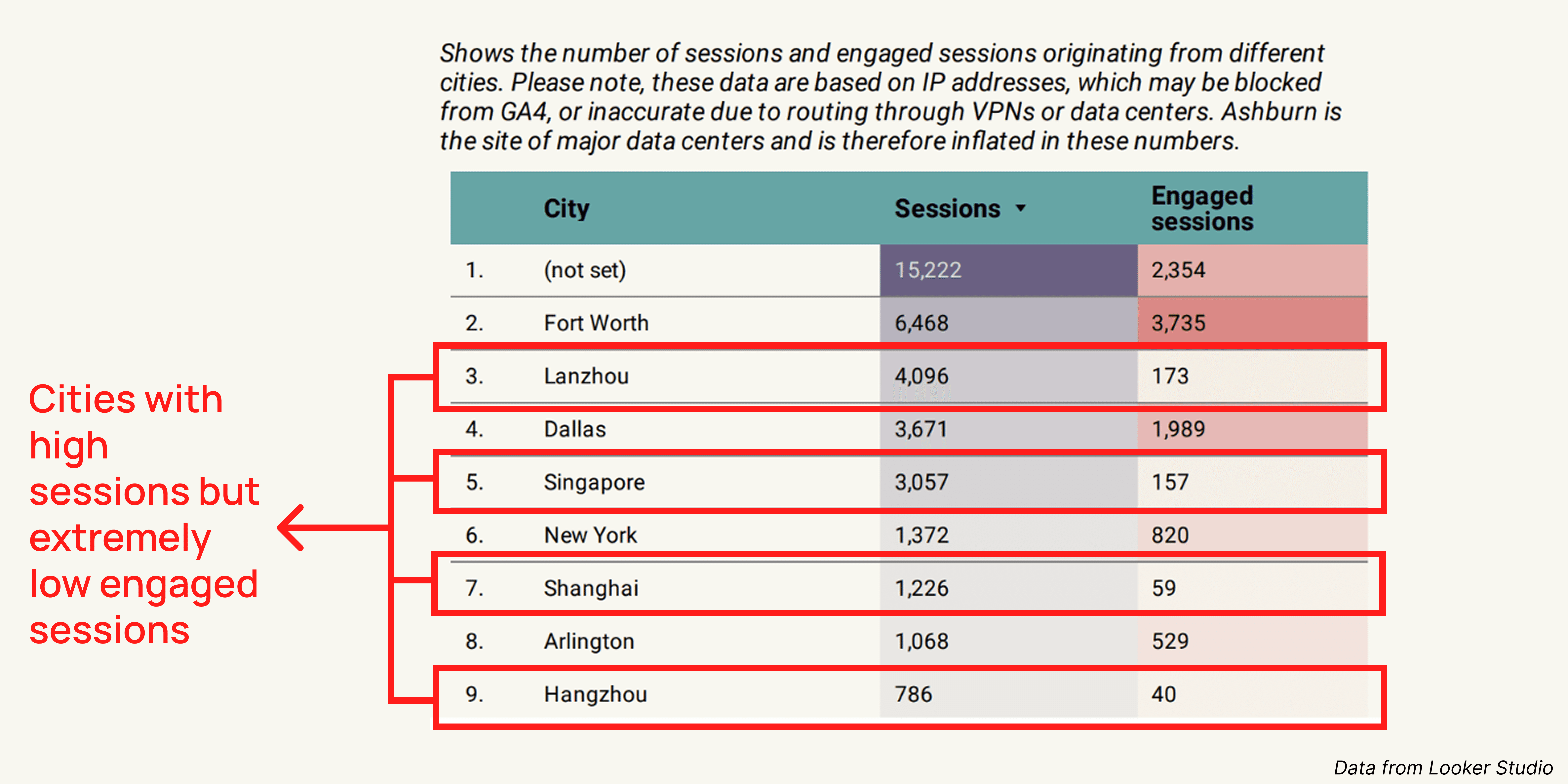 Cities like Lanzhou, Shanghai, Singapore, Hangzhou, and Ashburn appeared at the top of the Sessions table — but with extremely low engaged-session counts, signaling bot presence.