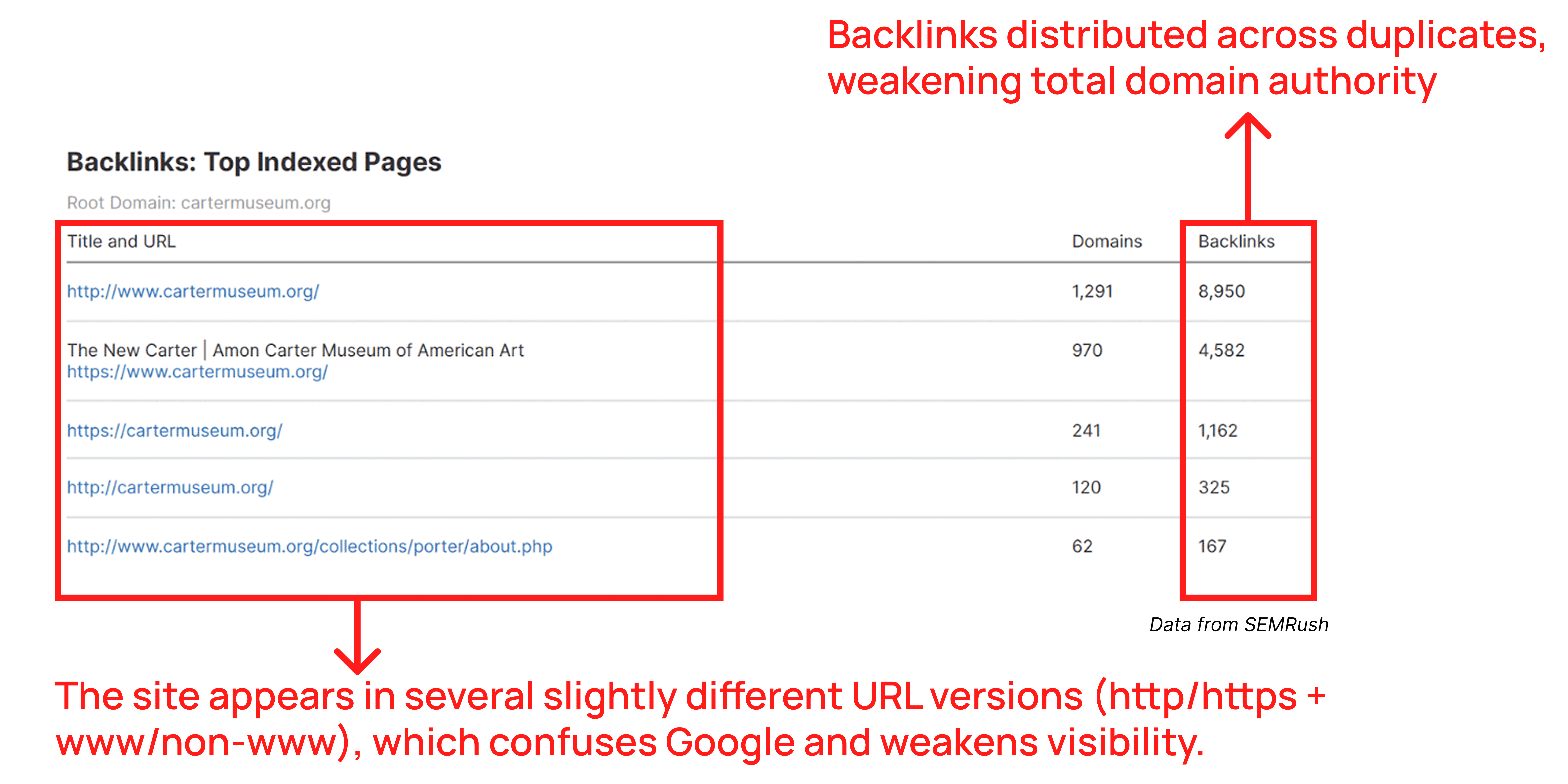 This makes it harder for Google to understand which version to rank, weakens overall search visibility, and weakens how AI search systems understand and reference the museum.