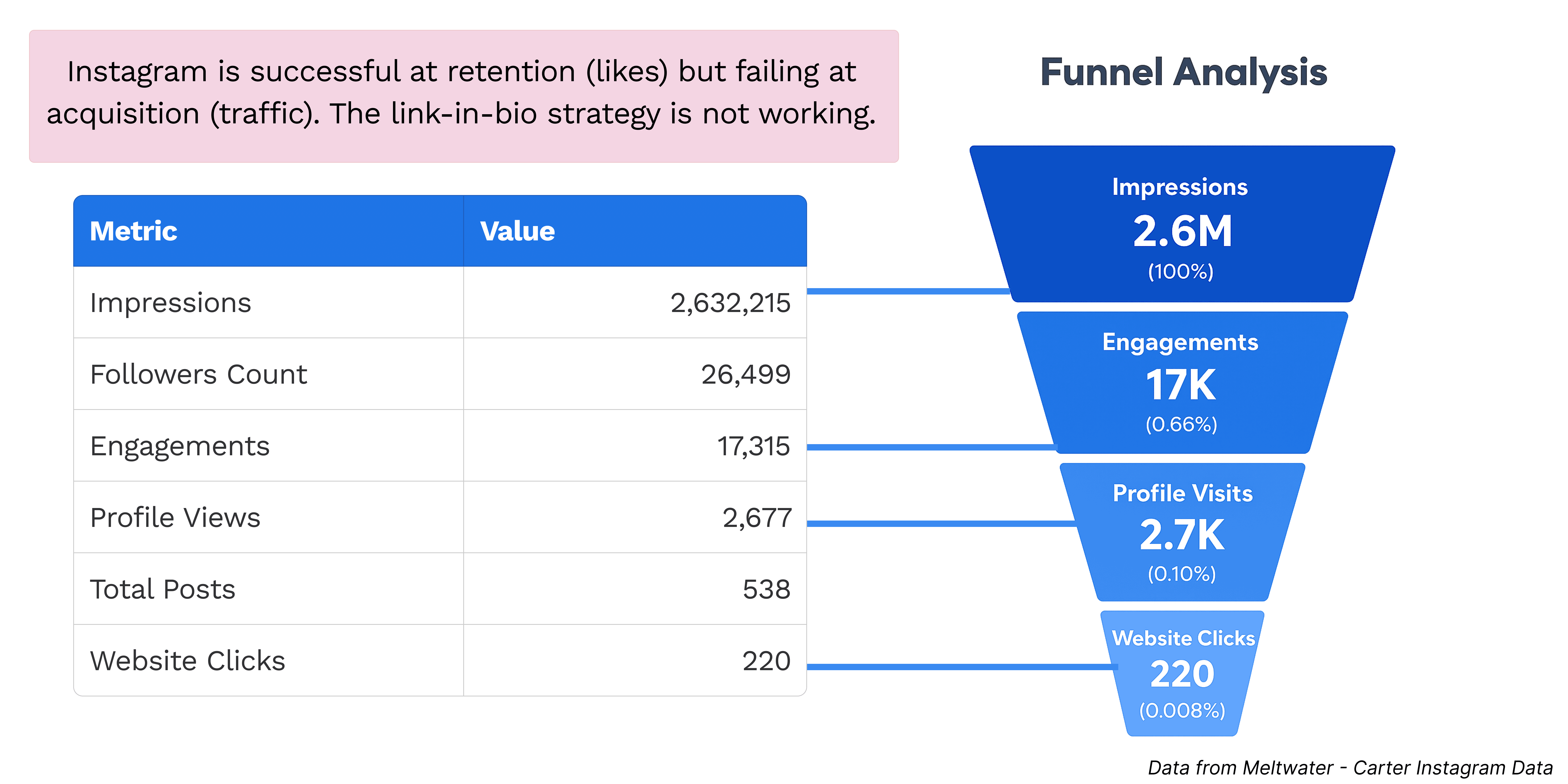 The Carter excels at attention and retention, but struggles to convert engagement into meaningful outcomes like visit actions and event registrations. The current link-in-bio setup is not working.