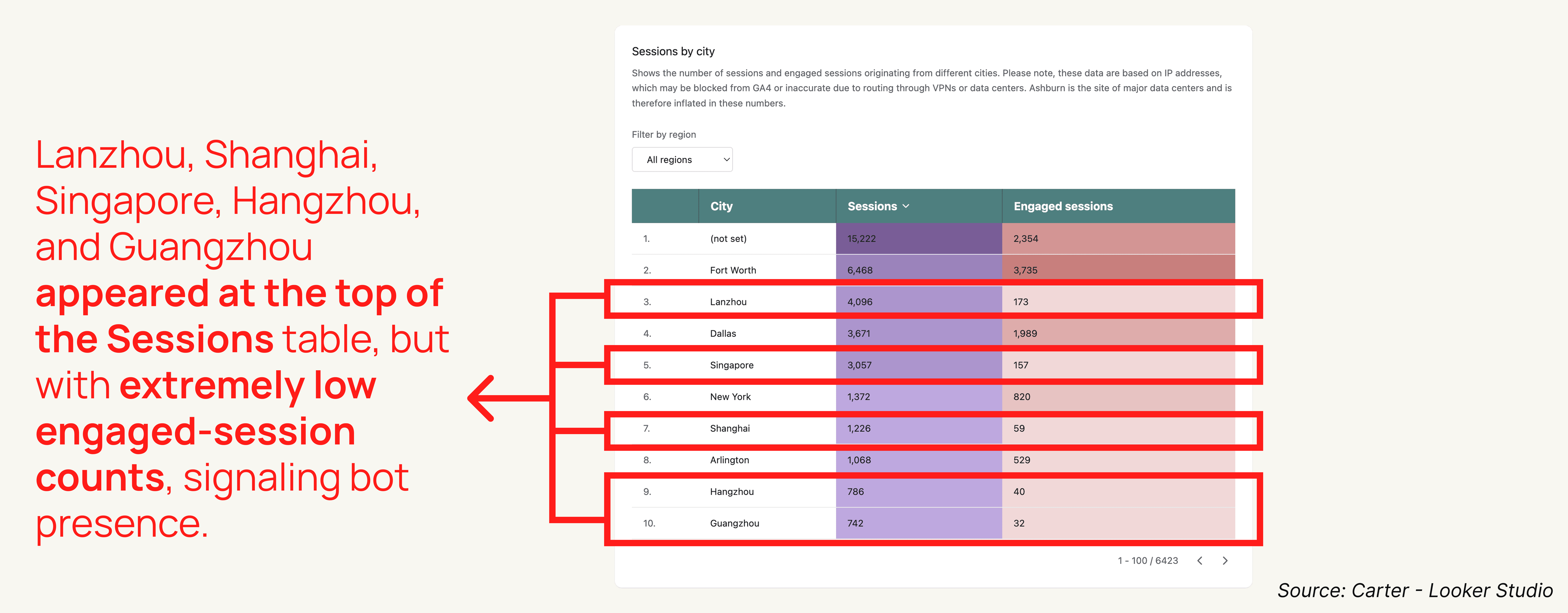 The bot-inflated city data had caused confusion for months, our filter proposal immediately clarified engagement metrics.