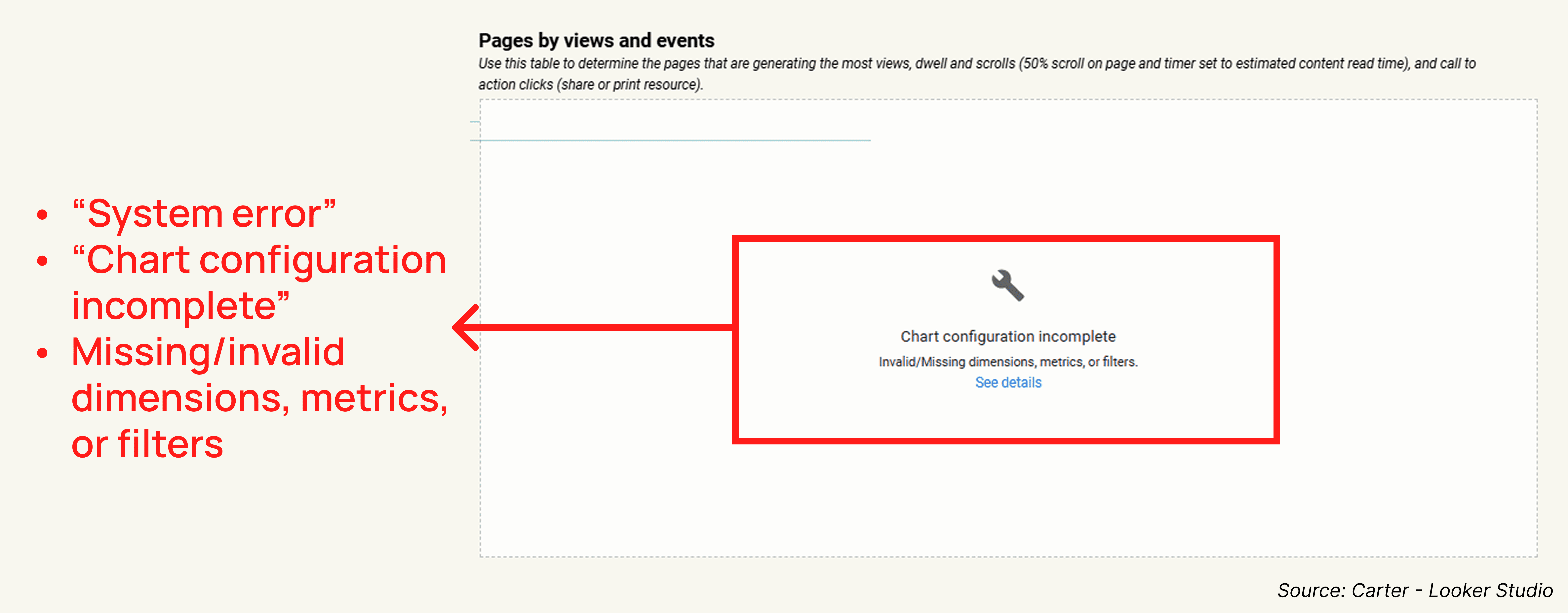 The “Collections Engagement” page displayed: “System error”, “Chart configuration incomplete”, and Missing or invalid dimensions and metrics.