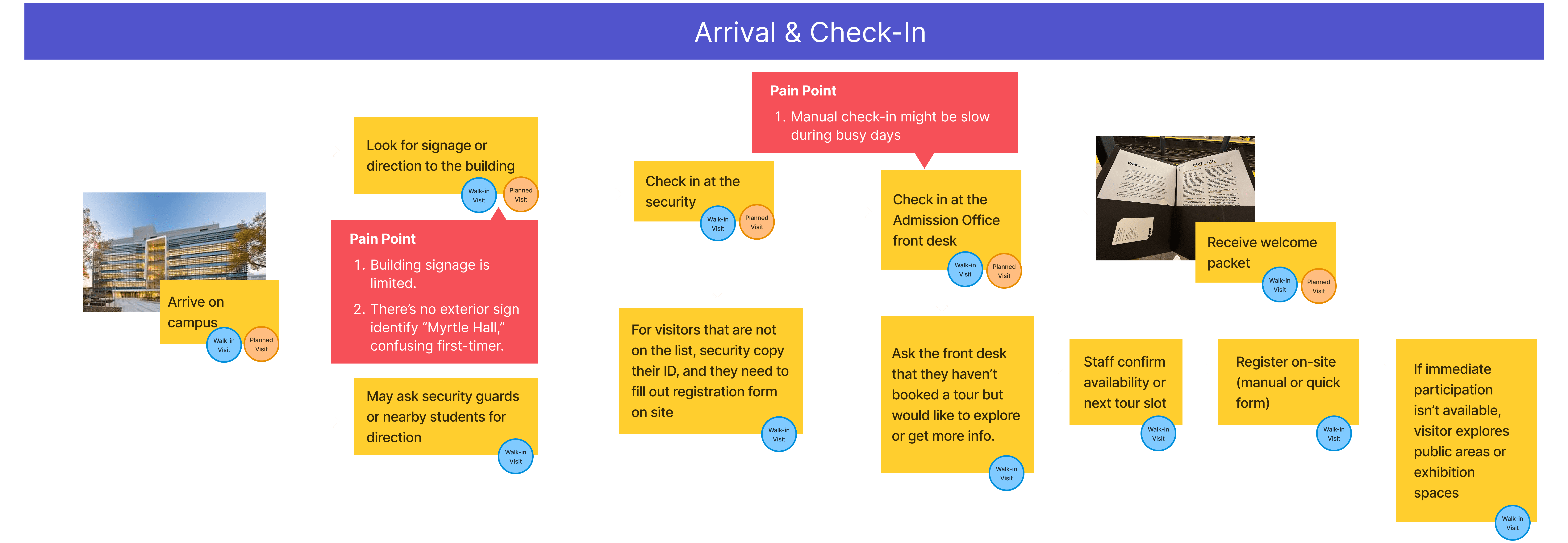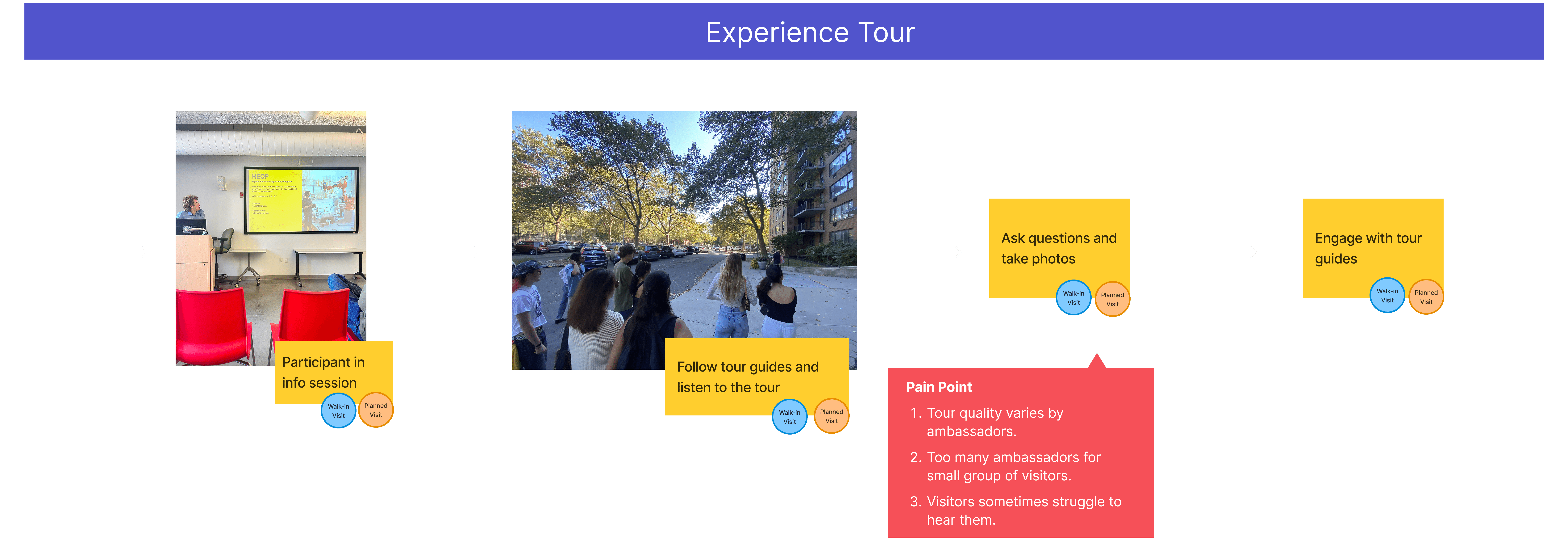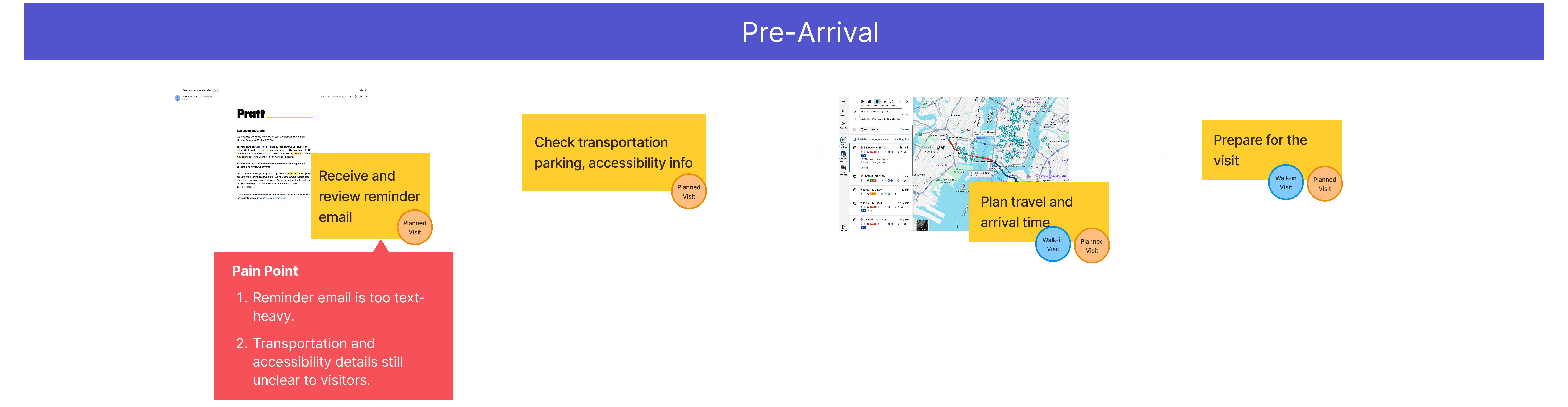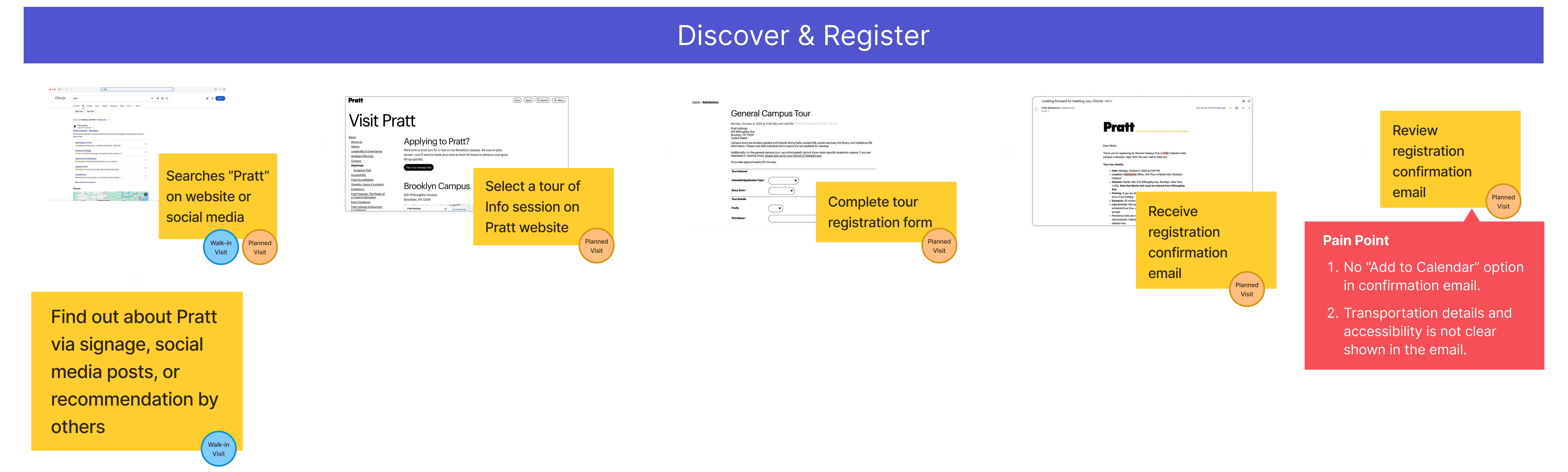Before proposing improvements, we conducted a service safari to experience the campus tour firsthand and mapped the visitor journey from the user’s perspective. This helped us identify the key touchpoints, decisions, and moments of friction that shape prospective students’ first impression of Pratt, from discovery and registration to tour preparation.
