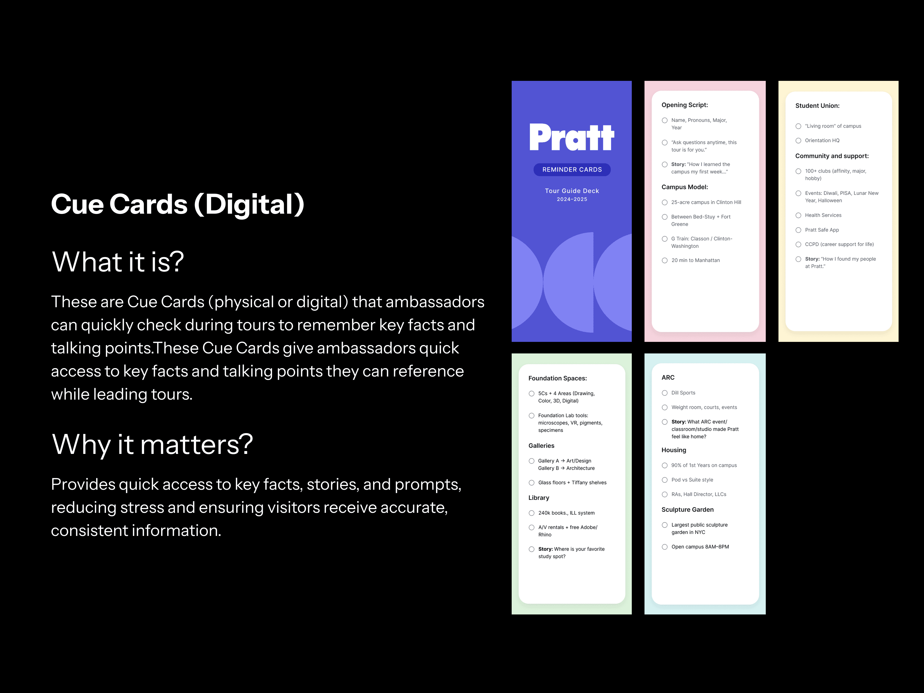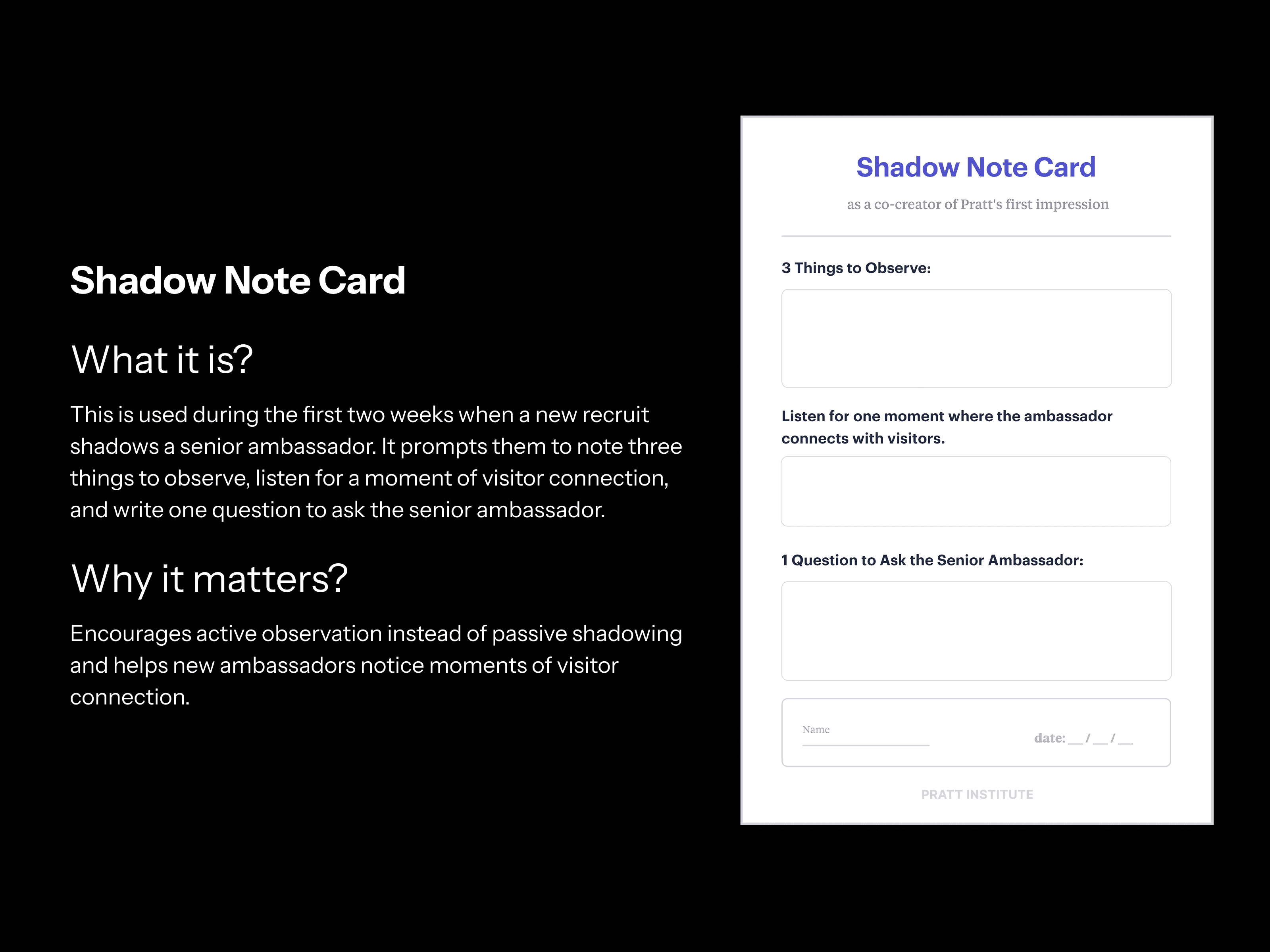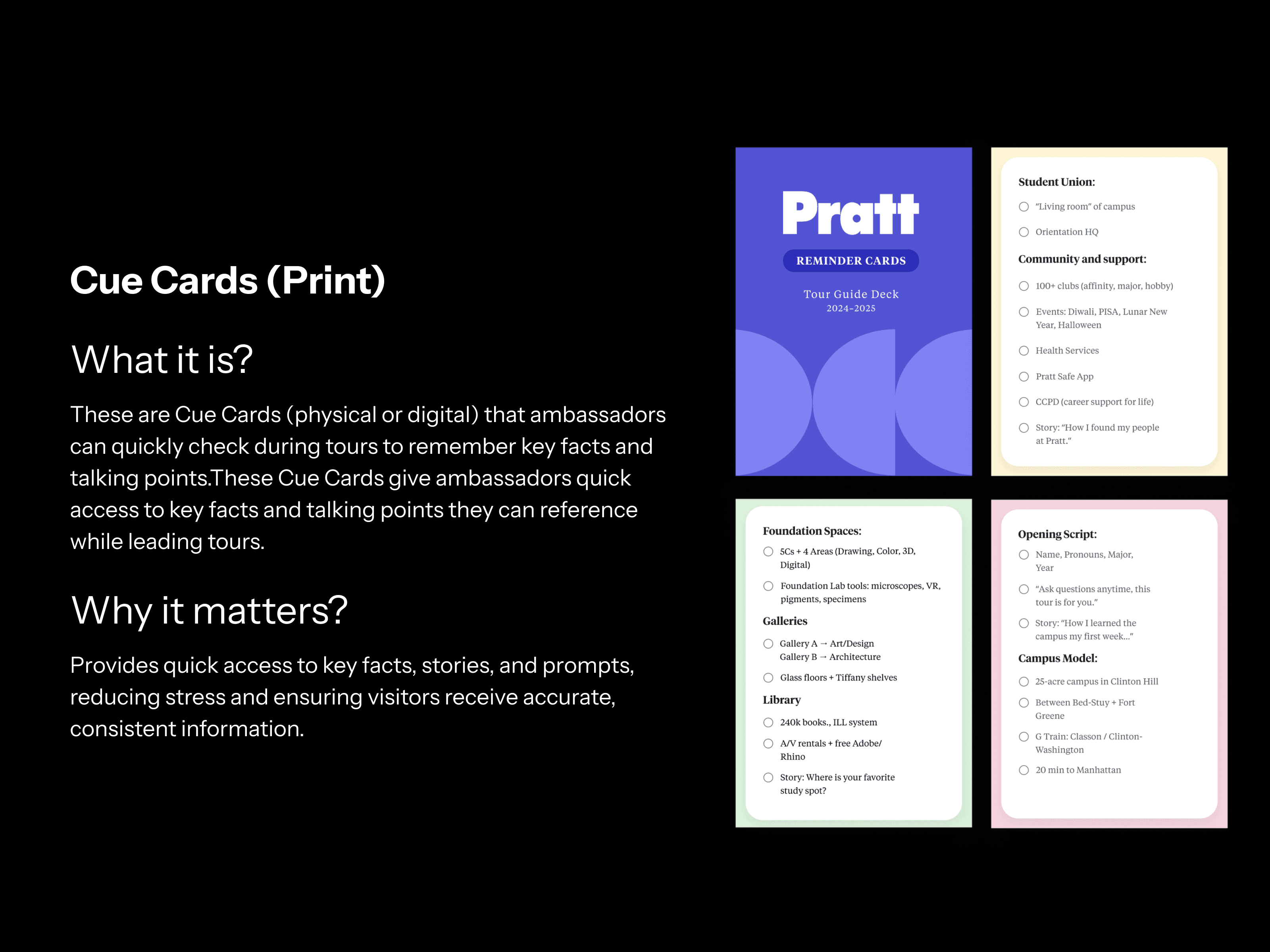 Student ambassadors play a critical role in shaping visitors’ first impressions of Pratt. However, our research revealed that tour quality varied widely depending on individual experience, confidence, and preparation. To address this inconsistency and reduce ambassador anxiety, we redesigned the training system to provide clearer, more consistent support before, during, and after tours. This approach improves tour consistency across ambassadors, reinforces Pratt’s values through observable behaviors rather than scripts, and shifts training from a one-time onboarding moment to a continuous learning loop that supports ongoing reflection, adjustment, and growth throughout the semester.