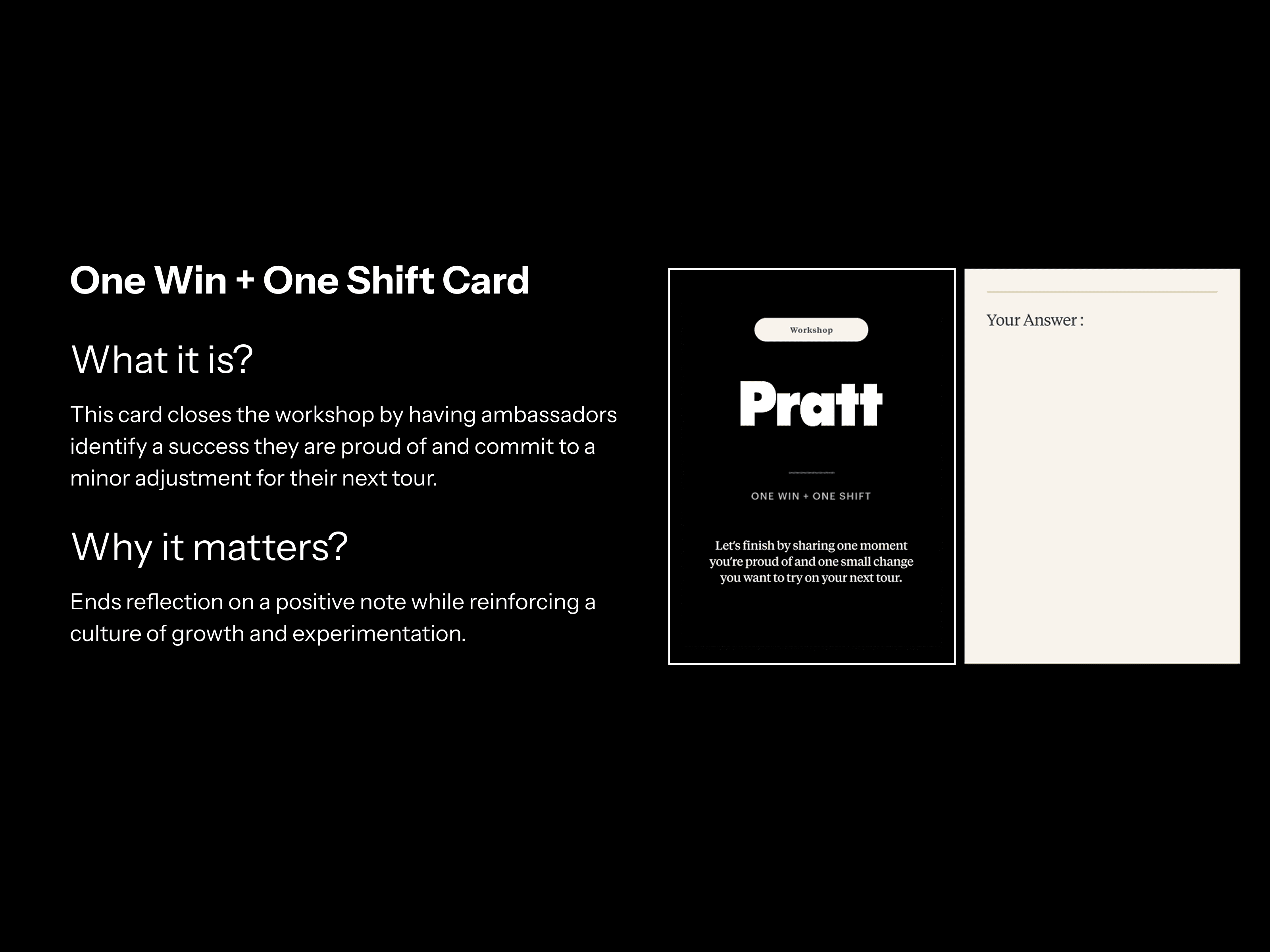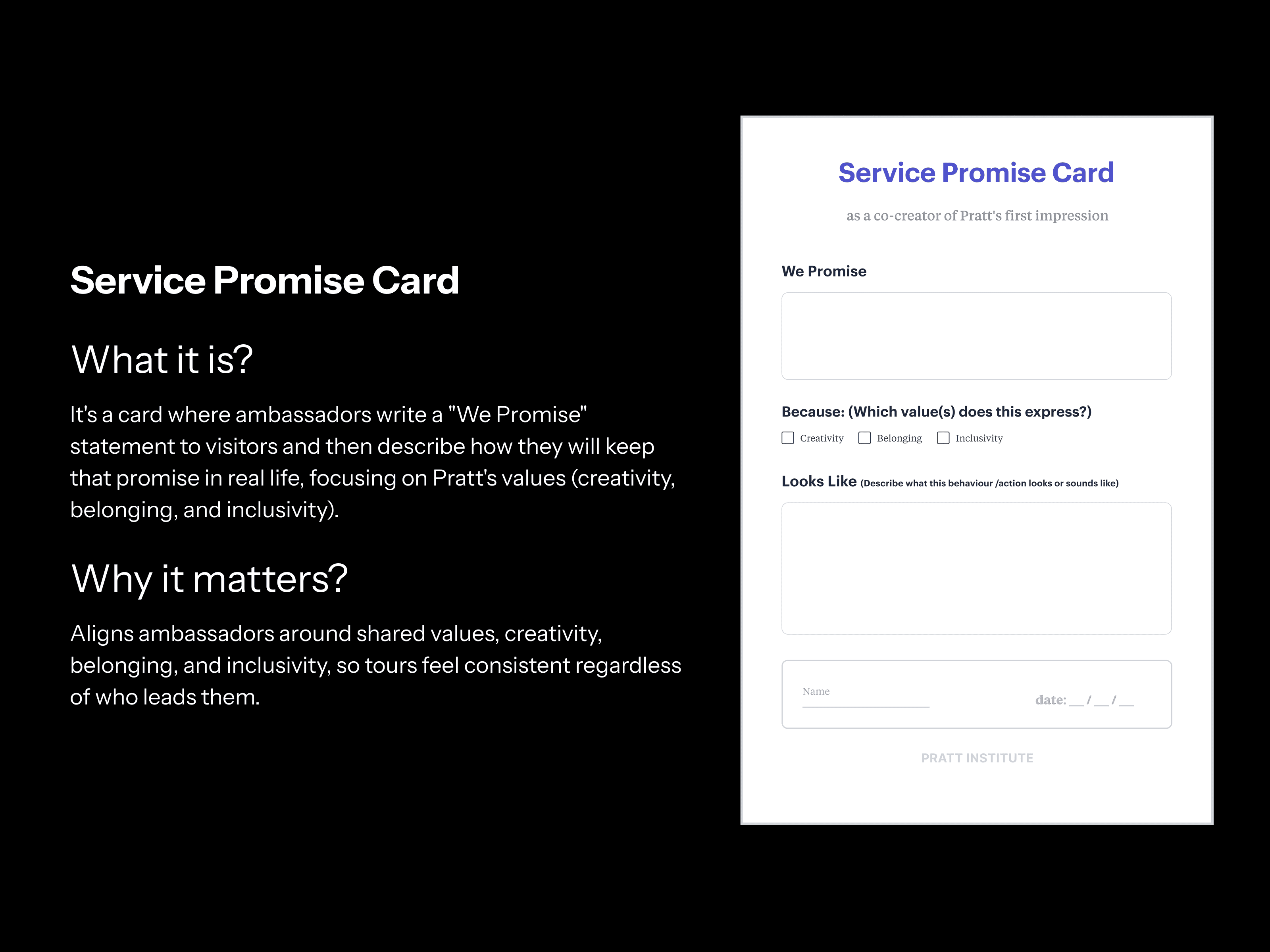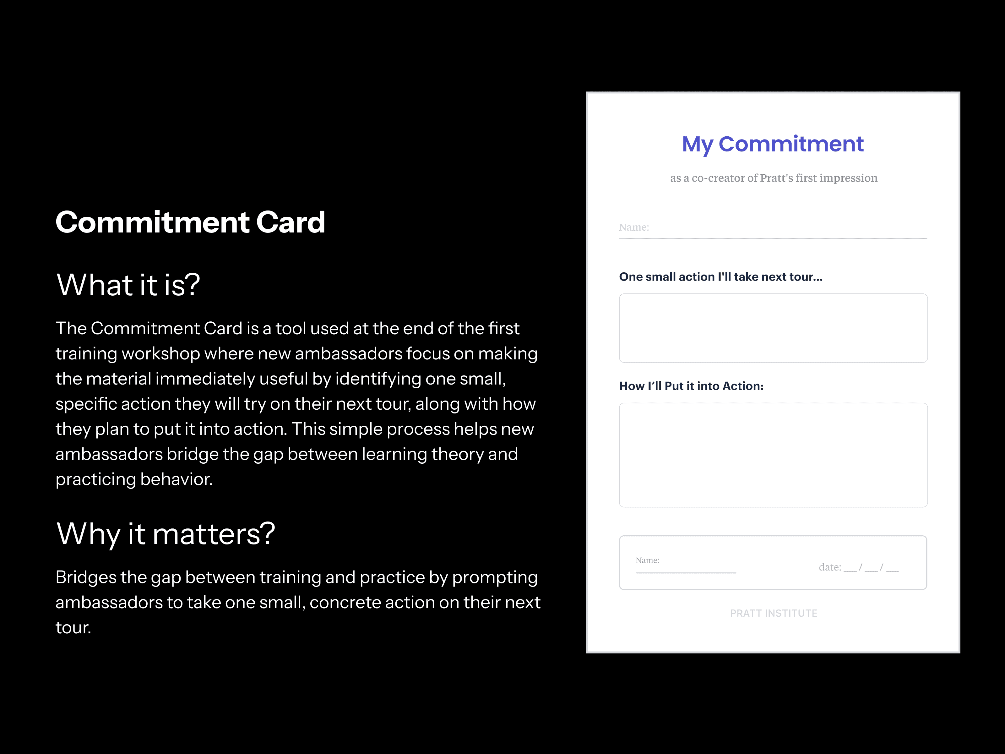 Student ambassadors play a critical role in shaping visitors’ first impressions of Pratt. However, our research revealed that tour quality varied widely depending on individual experience, confidence, and preparation. To address this inconsistency and reduce ambassador anxiety, we redesigned the training system to provide clearer, more consistent support before, during, and after tours. This approach improves tour consistency across ambassadors, reinforces Pratt’s values through observable behaviors rather than scripts, and shifts training from a one-time onboarding moment to a continuous learning loop that supports ongoing reflection, adjustment, and growth throughout the semester.