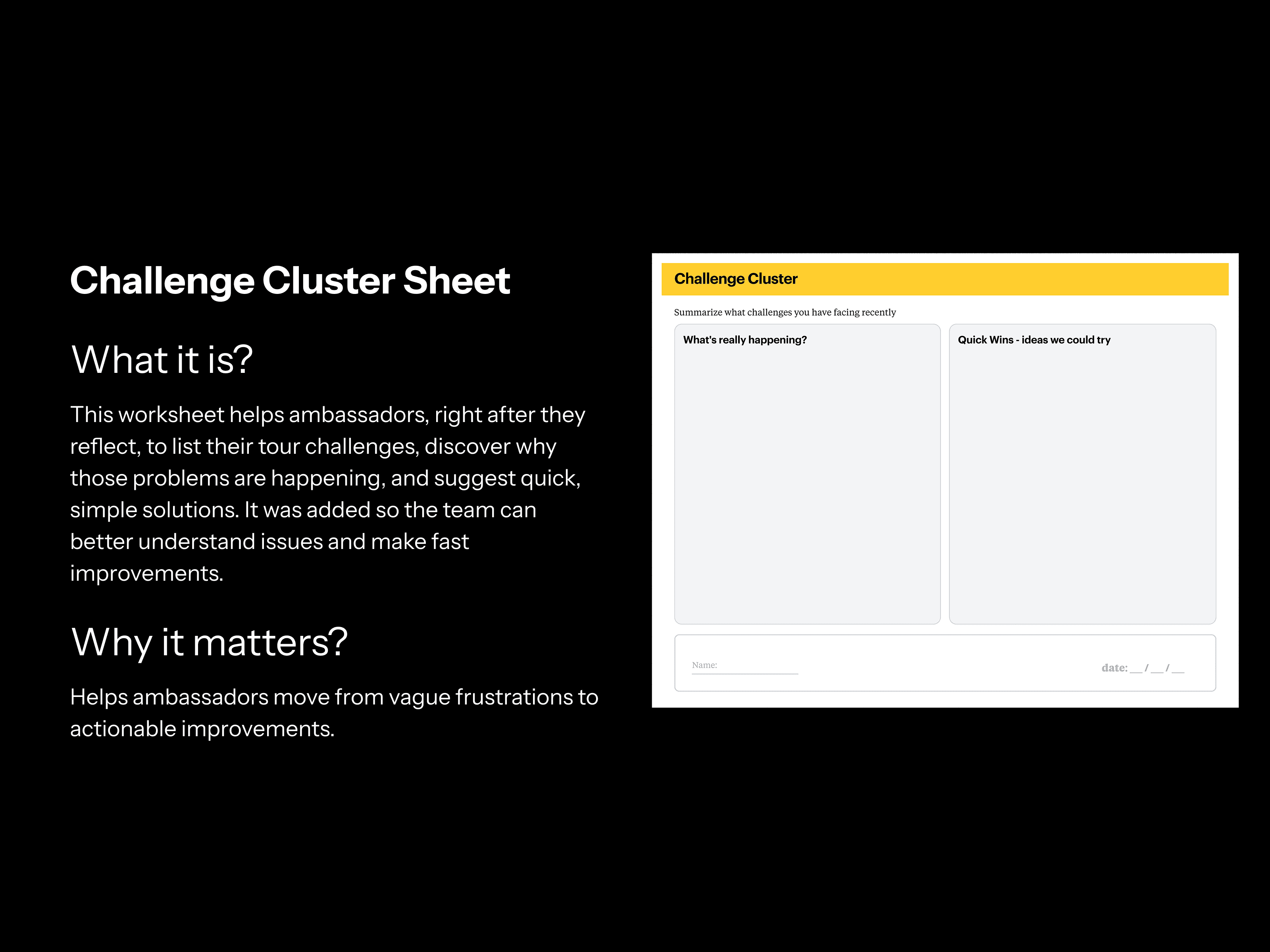 Even experienced ambassadors can feel pressure when leading tours. To reduce cognitive load and improve consistency, we introduced lightweight tools ambassadors can reference in the moment.