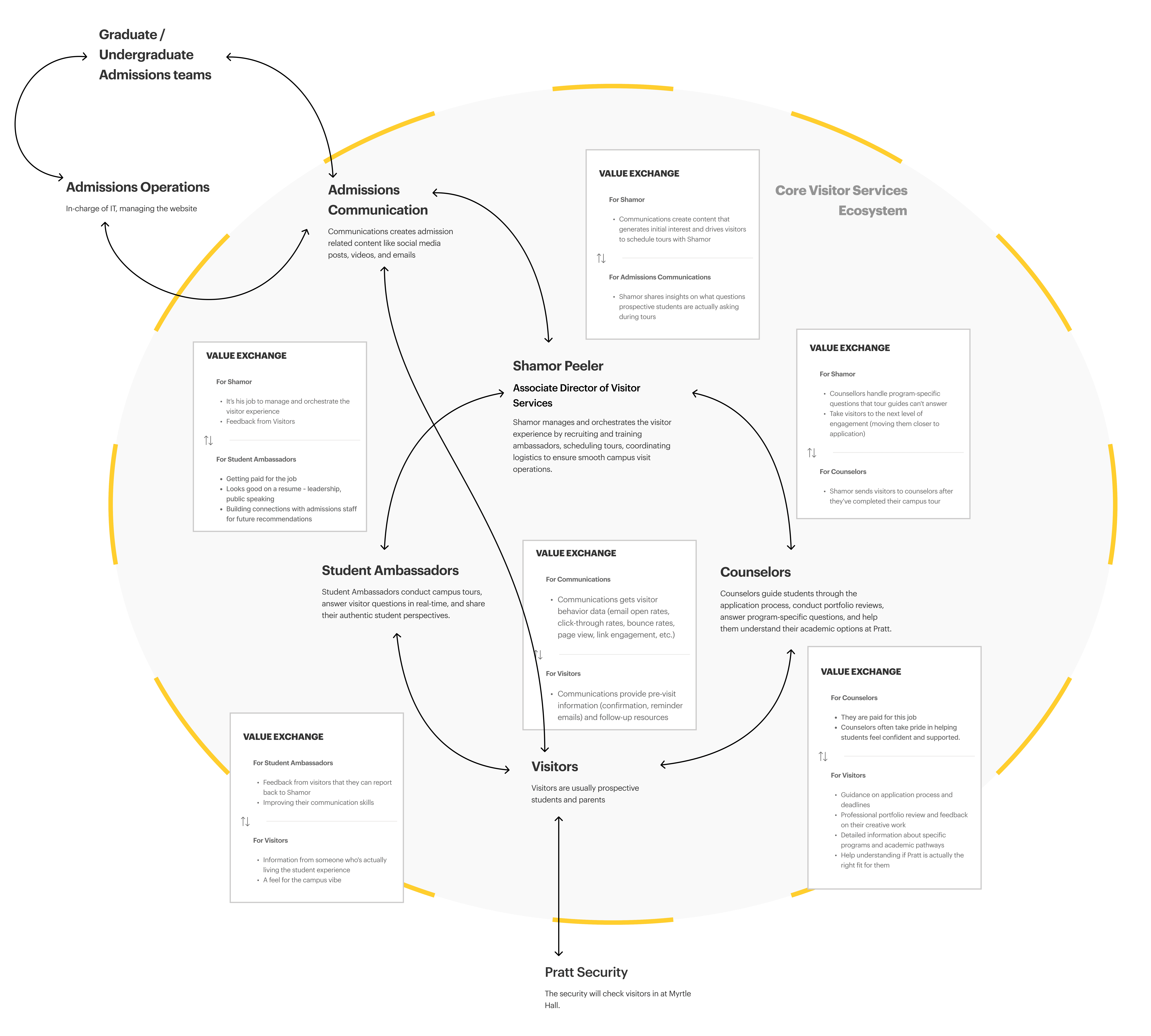 The visitor experience at Pratt is shaped by multiple actors—visitors, student ambassadors, admissions leadership, counselors, communications teams, and institutional systems—working together across different touchpoints.